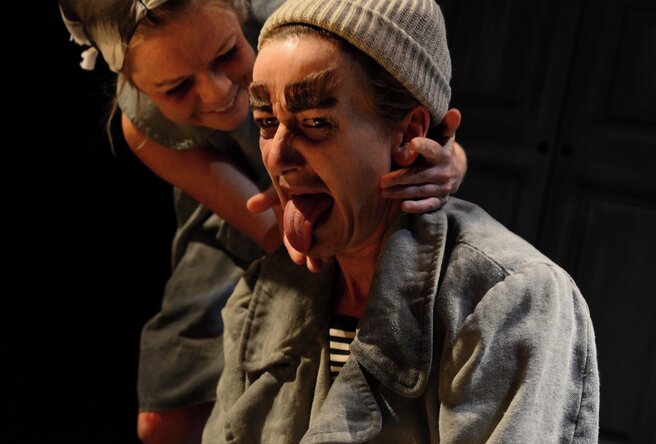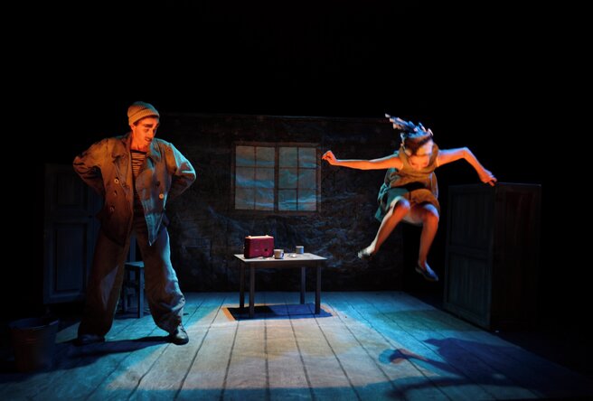 Ambitions as described above are however worthless unless the show works on the more concrete level. Absurd humor and a surprising course of action is the performance’s spine. As with our other productions, movement and choreographed situations is an important element. The two performers act, dance, and manipulate objects. The action is accompanied by a pre-recorded voice-over. The voice-over can be translated into different languages for international touring.